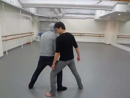 クリンチ状態から、前足と後ろ足を入れ換えるように後ろへジャンプします。
